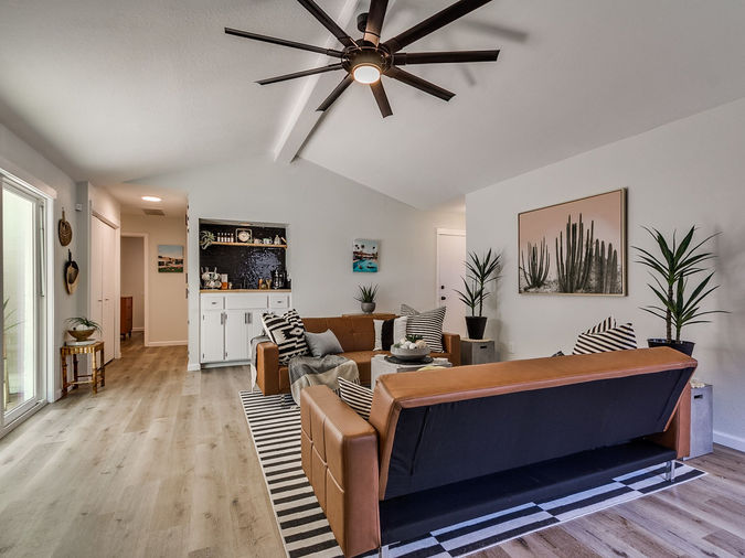 Welcome to "The Yellow Door," a modern oasis nestled in the heart of West Norman, where Palm Springs-inspired decor meets the spirit of fun and relaxation. This renovated home is your private retreat, where every detail has been thoughtfully designed to create a warm, modern ambiance with a playful twist.